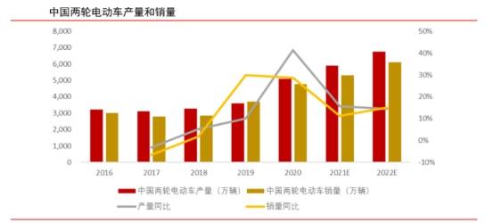 根據(jù)艾瑞咨詢發(fā)布的《2021 年中國兩輪電動車智能化白皮書》,2016-2020年,我國兩輪電動車產量從 3,215萬輛增加至5,100萬輛;同期,我國兩輪電動車銷量從3,000萬輛增加至4,760萬輛,CAGR 為 12.23%。其中,2020年我國兩輪電動車產量同比增速高達41.3%,我國兩輪電動車銷量同比增速為28.6%,主要系因為國內各地新國標過渡期限臨近,兩輪電動車市場上超標兩輪車的更新替換需求高漲。中期來看,我國兩輪電動車未來將保持穩(wěn)定增長。一方面,2021 年起,超標兩輪電動車將正式迎來大量清退替換,替換需求將繼續(xù)推高中國兩輪電動車的產銷量;另一方面,隨著共享電動自行車運營規(guī)范化程度提升,哈羅、美團等平臺有望加大共享電動自行車的投放量。艾瑞咨詢預計,2022年我國兩輪電動車銷量將達到 6,100 萬輛。